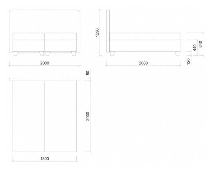 Komfortná posteľ typu BOX-BETT. Spodný čalúnený rám postele tvorí konštrukcia z pevných lamiel s masívnymi drevenými nožičkami.